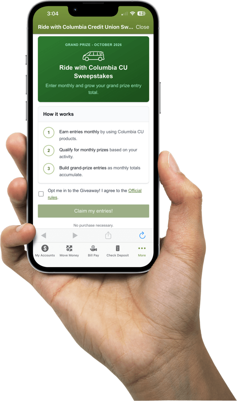 No purchase necessary. Void where prohibited. Sweepstakes runs April 1-October 31, 2026. Open to WA and OR residents age 18+. Automatic entries available to Columbia Credit Union members who opt in and meet entry criteria; manual entry also available. See Official Rules for details, eligibility restrictions, entry conditions, prize descriptions, and how to enter without purchase. All third-party names and trademarks are the property of their respective owners. This giveaway is not sponsored, endorsed, or affiliated in any way with Volkswagen, or their affiliates.